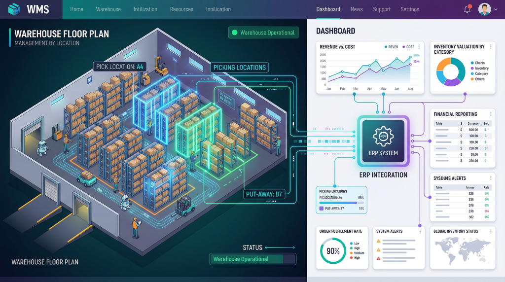 Sự kết hợp hoàn hảo nhất là tích hợp WMS chuyên sâu vào hệ thống ERP, giúp doanh nghiệp vừa quản lý chi tiết thực địa, vừa có bức tranh tài chính tổng thể.